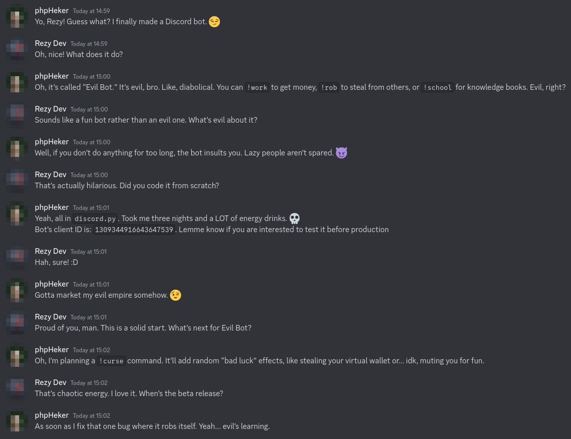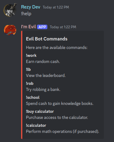 Since I don’t want to go over how to download the bot’s source code and set it up in your local environment, I’ve written a detailed README.md on how to get the source code and bring the Discord bot online. You can find it in the GitHub repository here: https://github.com/Rezy-Dev/Evil-Bot