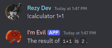 This seems interesting, doesn’t it? The bot directly accepts the input !calculator <math expression>, calculates it, and shows us the result.